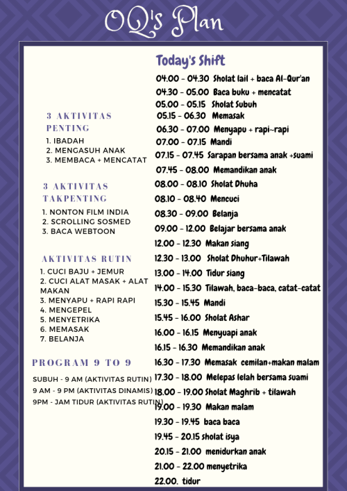 Untuk menjadi manajer keluarga yang handal, maka perlu perencanaan harian. Dan di bawah ini perencanaan harianku. Diawali dengan menuliskan 3 aktivitas penting dan 3 aktivitas tak penting.